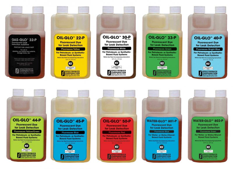 UV barvivo OIL - GLO® je dodáváno v sedmi provedeních, která se liší barvou světélkování UV - barviva po ozáření UV - lampou. Nejčastěji prodávaná barviva pro hydraulické okruhy, průmyslové převodovky, vzduchové kompresory a další stroje jsou následující: